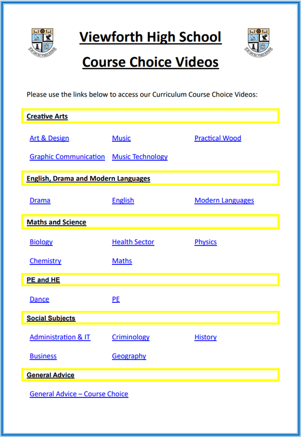 Please find below the link to access the Course choice video sheet:Viewforth High School – Course Choice Video Sheet 2026-27 Please find the Link below to the S2 into S3 Course Choice Forms:S3 Course Choice Form Please find the link below to the Senior Phase Course Choice Forms:S5-S6 Course Choice Form
